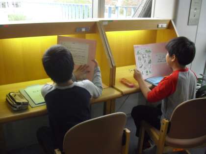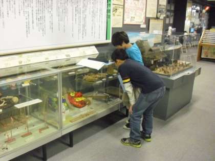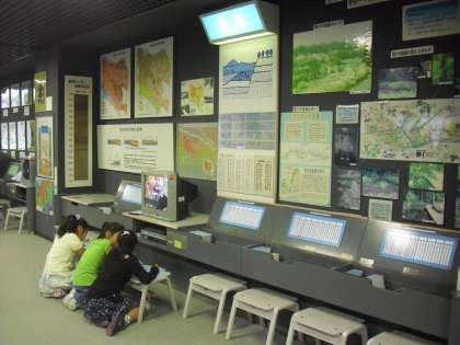 1つ目は「地勢」のコーナーです。ここでは、面積、地形、地質、河川、気象、緑と水について調べることができます。近くには古い道具なども展示されています。落ち着いて学習できる仕切りのついた机もあります。