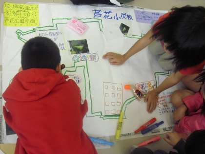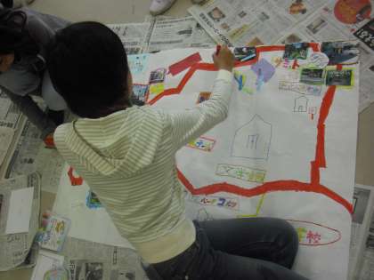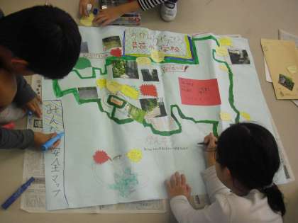 3年生の総合的な学習の時間の授業の様子です。安全マップを作成しているところです。自分たちが調べたことを相手に伝えるためには、どのように表現したらよいか、グループで相談しながら作業を進めています。
