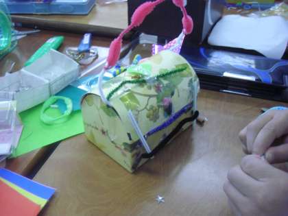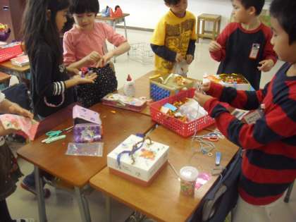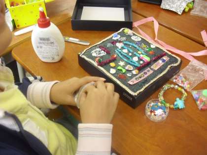 1年生の図画工作の授業の様子です。お気に入りの箱を作っているところです。ビーズなどの飾りをつけたり、リボンをつけたりしながら楽しく作成しています。いったい何を入れるのかな?