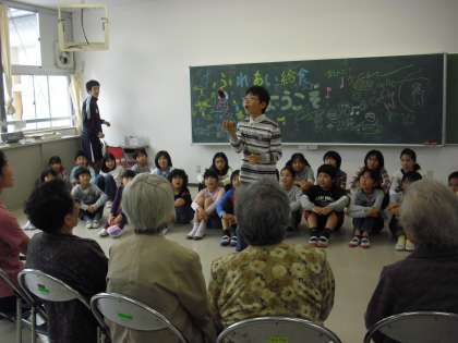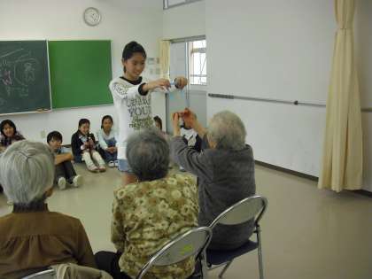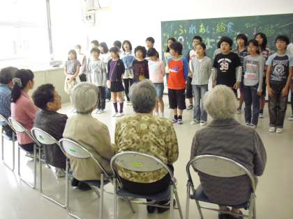 会食の後は、楽しいひと時を過ごしていただきます。歌を聴いてもらったり、昔遊びでふれあったりしました。とても喜んでくださいました。直接かかわり合うことで子どもたちのふれあい力はより一層高まっていきます。
