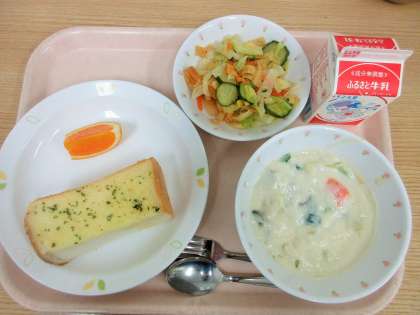 今日は、ガーリックトースト、クリームシチュー、パリパリサラダ、清見オレンジ、牛乳です。