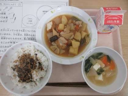 今日は、麦ごはん、かみかみ佃煮、春野菜のうま煮、打ち豆のみそ汁、牛乳です。