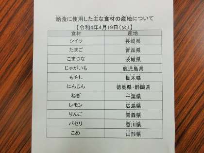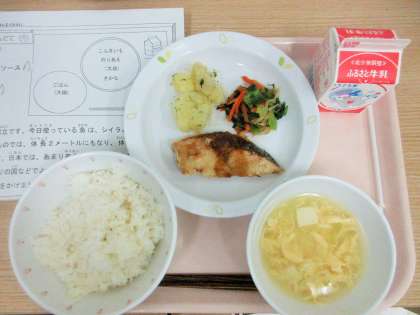 今日は、ごはん、魚のバーベキューソース、粉ふきいも、野菜ののり和え、かきたま汁、牛乳です。