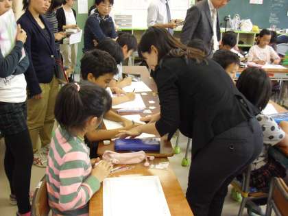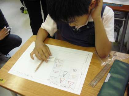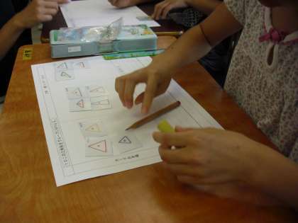 3年生の算数少人数指導の研究授業の様子です。三角形の学習をはじめたところです。前の時間を振り返って、一人一人が三角形の特徴から仲間分けをしています。どこに着目するかで分け方が異なります。
