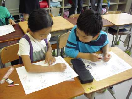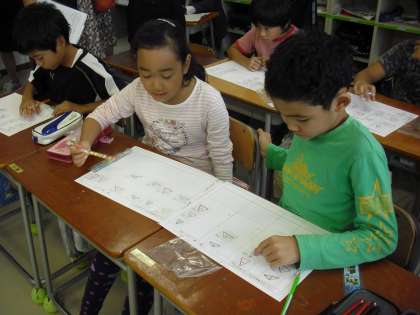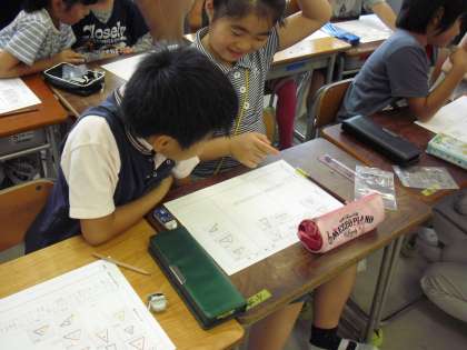 隣の友達と自分の仲間分けの分け方を説明しているところです。友達の考え方を聞くことで自分の考えと比べながら新しい気付きや考えも生まれます。