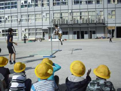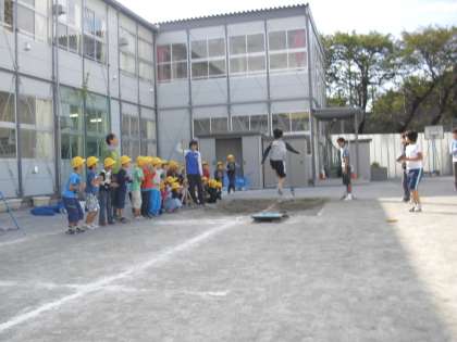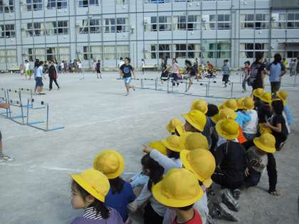 6年生が明日の連合運動会の最終調整をしているところです。その様子を見つめる1年生。6年生を応援にやってきました。走るスピードや、ダイナミックなジャンプを見つめる1年生の目には6年生がかっこよく映っているに違いありません。