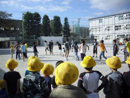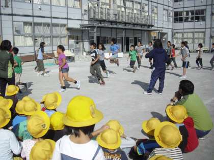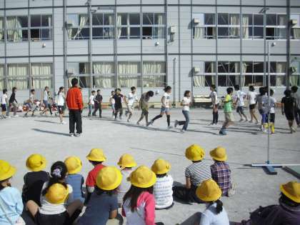1・2・3組と仲良しパートナーさんの長なわ跳びの様子を見学します。リズミカルに跳ぶ様子とそのスピードに、1年生はじっと見入っていました。