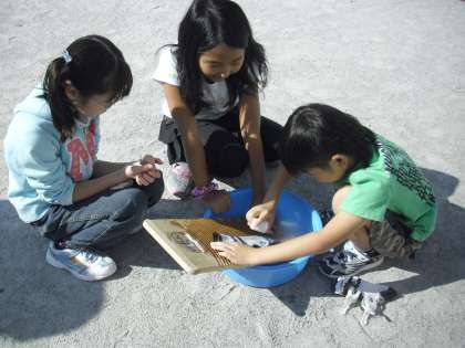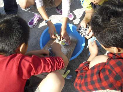 4年生の社会科の授業の様子です。洗濯板を使って洗濯をしているところです。板の凸凹の感触を確かめながら、持ってきたハンドタオルやハンカチをゴシゴシと洗っています。体験的な活動を通して具体的に昔の人の生活を考えていきます。