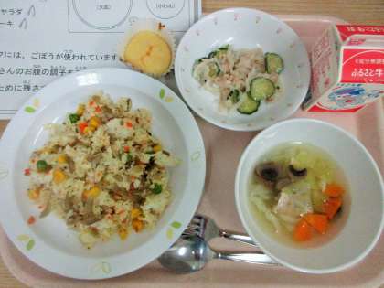 今日は、鶏ごぼうピラフ、野菜とレンズ豆のスープ、大根とツナのサラダ、ヨーグルトケーキ、牛乳です。