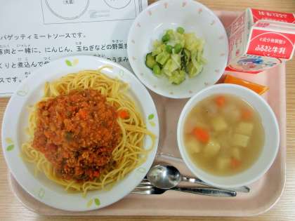 今日は、スパゲッティミートソース、コンソメスープ、枝豆サラダ、デコポン、牛乳です。