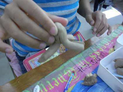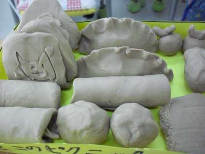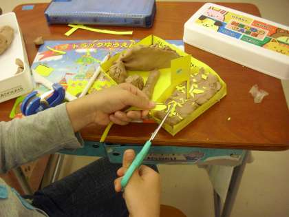 2年生の図画工作の授業の様子です。ピクニックに出かけたときのお弁当をねん土で作っているところです。ソーセージに切れ目を入れてみたり、タコの足形にしてみたり。子どもたちはよく見ているんですね。色紙を細かく切ってふりかけに見立てるなどアイデア盛りだくさんです。ギョウザの皮の感じがとても上手です。