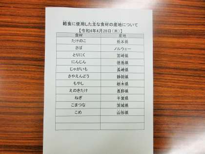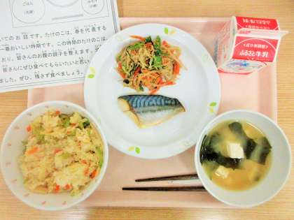 今日は、たけのこご飯、さばの塩焼き、野菜のごまだれかけ、みそ汁、牛乳です。