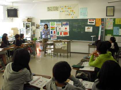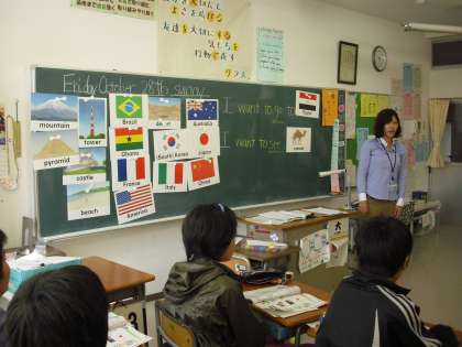 6年生の英語活動の授業の様子です。今日は国がテーマです。「I want go to ○○」英語活動支援員の先生の発音に習いながら、話します。絵カードの国を見ながら、自分の行ってみたい国を当てはめながら伝えて合っていました。