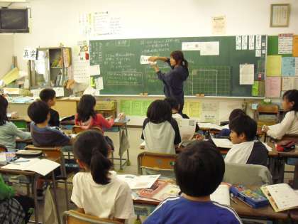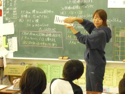 4年生の算数の授業の様子です。大きな面積の単位について学習しているところです。これまで学習してきた平方メートルとaやhaなどの単位との関係を理解していきます。1a=100平方メートル等です。授業では、フラッシュカードを使いながら単位換算する学習活動を取り入れていました。