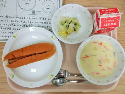 今日は、ホットドッグ、クリームスープ、フレンチサラダ、牛乳です。
