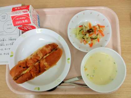 今日は、ドライカレーサンド、コーンポタージュ、カリカリベーコンのサラダ、牛乳です。