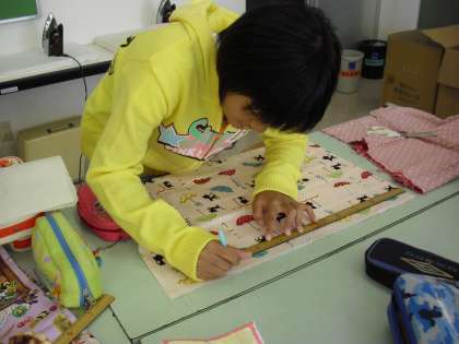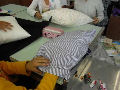 6年生の家庭科の授業の様子です。生活に役立つものがテーマで、カバーやクッション、手さげ袋等、各自が思い思いのものを製作しています。お互いの作品のよさを認め合ったり、アドバイスし合ったりしながらよりよい作品を目指しています。