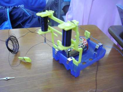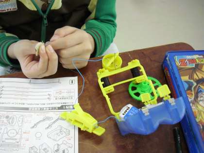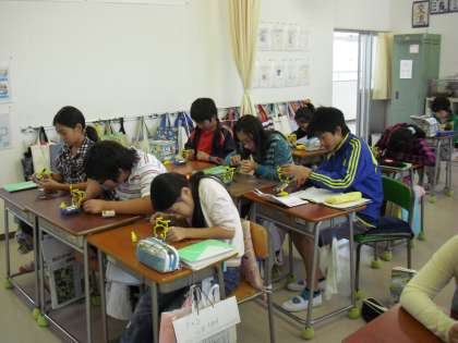 5年生の理科の授業の様子です。「電流のはたらき」を学習しているところです。一人一人に実験キットがあり、各自が実験を進めていきます。自分で作った手作りコイルに電流を通して、電磁石になるか調べています。結果だけでなく、その過程も自分で行うことで理解が深まります。