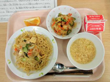 今日は、上海麺、かきたまスープ、野菜の中華風味、甘夏みかん、牛乳です。