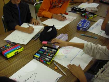 図書委員会の様子です。電算化を前に本の返却を呼びかけるポスターを作成しているところです。この後、本の整理や読書月間で取り組んだ学級毎の読書の木を各クラスに配りました。