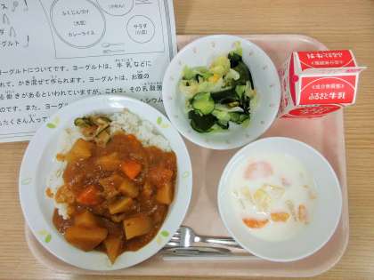 今日は、ポークカレーライス、手作り福神漬け、グリーンサラダ、フルーツヨーグルト、牛乳です。