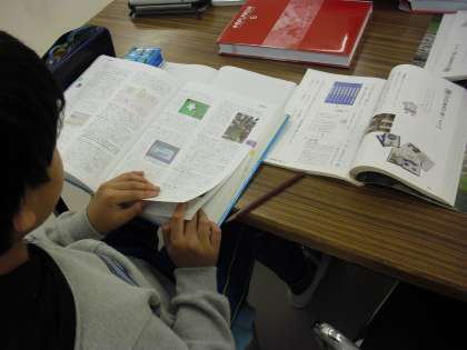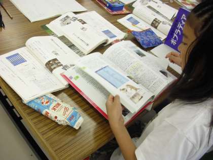 4年生の国語の授業の様子です。図書室で百科事典を使ってリサイクルについて調べています。「百科事典を使って調べよう」という学習です。インターネットが便利な現在ですが、百科事典や辞書等を活用して調べることもしっかりと身に付けたい力です。