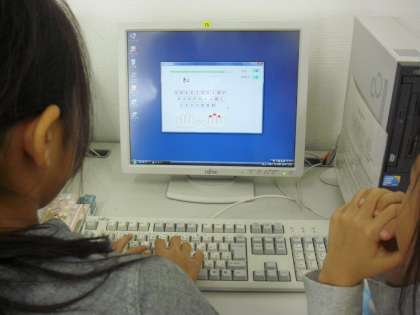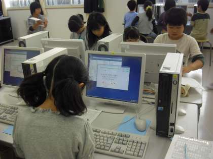 3年生の国語の授業の様子です。パソコン室でローマ字のタイピングに取り組んでいるところです。ゲーム形式になっていて、時間内にローマ字を正確に打った数が点数化されます。子どもたちは真剣に取り組んでいました。