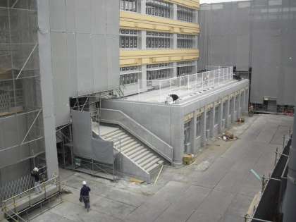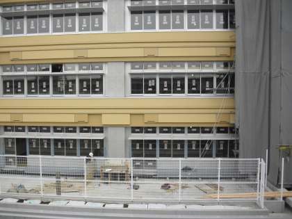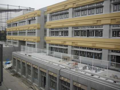 現在の新校舎建設工事の様子です。小中学校棟は大部分のシートが外され校舎の外観を臨むことができます。内装工事も進んでいます。ベランダで作業をする人たちも確認できます。今日も安全に工事が進むことを願っています。