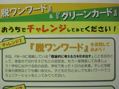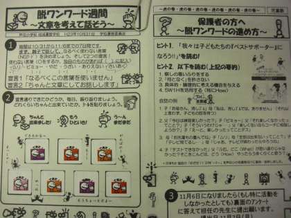 10月31日から11月6日に実施した「脱ワンワード週間」にご協力いただきありがとうございました。これは地域運営学校として学校運営委員会が子どもたちに身に付けさせたい「ふれあい力」をはぐくむための施策の一つです。子どもたちのコミュニケーション力を高めるために、家庭での家族との会話に焦点を当てた活動です。単語の会話ではなくできるだけ具体的に伝えることをねらいとしています。詳しくは、先日配布しました「ベストサポーターになろう」のリーフレットで紹介していますのでお読みください。