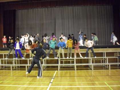 2年生の舞台を使った学芸会の練習の様子です。2年生は「三つのまほう」という劇を演じます。まほうつかい学校の子どもたちが繰り広げるお話です。この劇の特徴は8曲の歌を取り入れたミュージカルになっているところです。各教室には、拡大した歌詞カードが掲示され、教室でも歌の練習を繰り返しています。はっきりした言葉で歌うように口を大きく開けて歌っています。今日は、歌いながら振り付けを合わせる練習もしました。集団で表現することで一体感を得ることができます。2年生らしく元気のよい劇にしていきます。