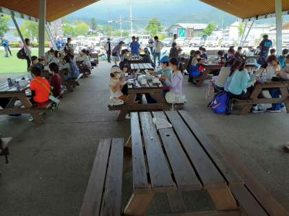 村めぐりのゴール地点、川場田園プラザでお弁当を食べました。たくさん歩いた後のごはんを、みんな美味しそうに食べていました。