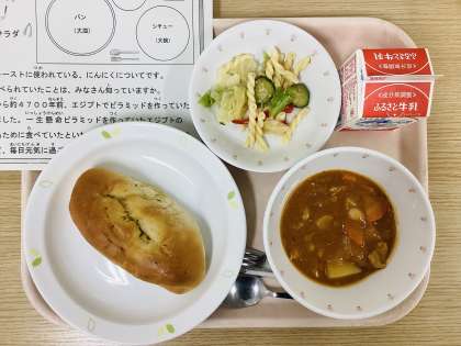 今日は、ガーリックフランス、ビーンズシチュー、ツナとマカロニのサラダ、牛乳です。