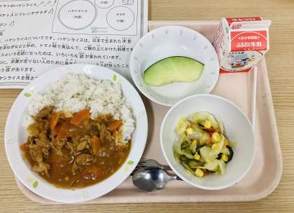 今日は、トマトのハヤシライス、ポテト入りフレンチサラダ、メロン、牛乳です。