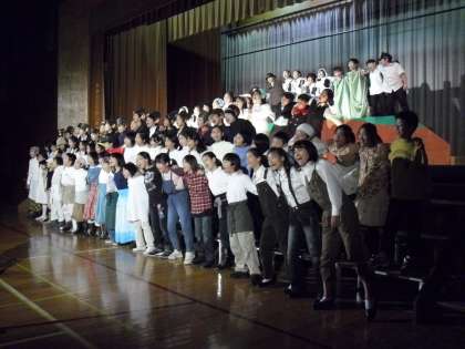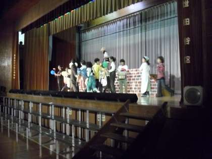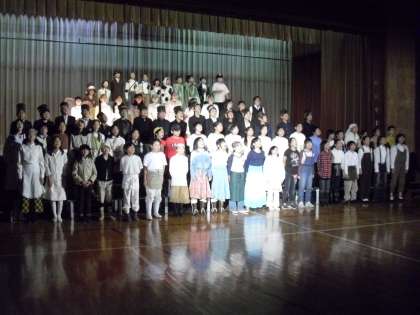 5年生の舞台を使った練習の様子です。5年生は「人間になりたかった猫」を演じます。子どもたちには、役になりきること、言葉の意味を理解すること、台詞がなくても舞台に出ていたら場面に合ったリアクションを考えて表現すること、そして何よりも演じることを楽しむことを心がけて指導しています。エンディングの歌「すてきな友達」は友情を感じさせる歌です。