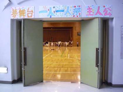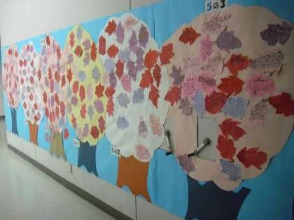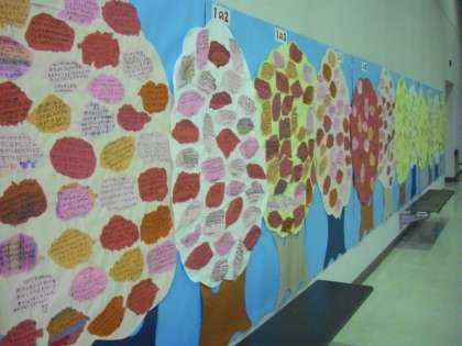 格技室前に飾った、子どもたち一人一人の学芸会への思いを綴った葉っぱをクラス毎に集めた木です。劇をご観賞する前に、ぜひ、ご覧いただきたいと思います。また、昨年の展覧会で行った子どもたちへのメッセージコーナーを今回も準備しています。子どもたちの熱演に対するメッセージを送ってあげてください。