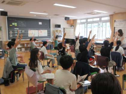 7月5日(火)4校時、音楽室では、6年4組の音楽「いろいろな音色を感じ取ろう」の学習が行われていました。
