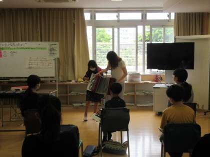 子供たちは、木琴やシンセサイザーなどの音色を聴いて、積極的に「演奏したい!」と言う姿がたくさん見られました。また、楽器の特徴を捉えて、その楽器を選んだ理由を発表していました。