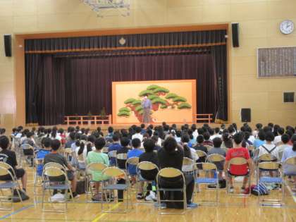 7月5日(火)5校時、体育館では、6年生の古典芸能鑑賞教室の学習が行われていました。今日は、千歳台小学校の6年生も来校し、一緒に鑑賞しました。