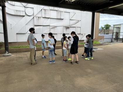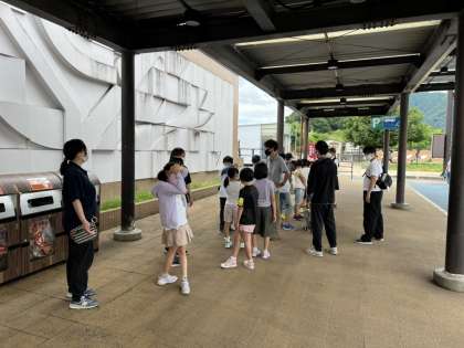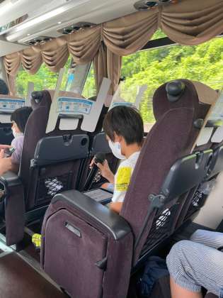 談合坂でトイレ休憩をしています。バスの中では、バスレクをして