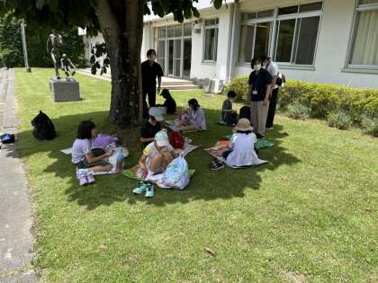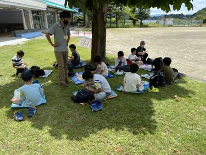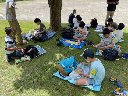 河口湖林間学園に到着しました。河口湖は、気持ちよく晴れています。