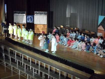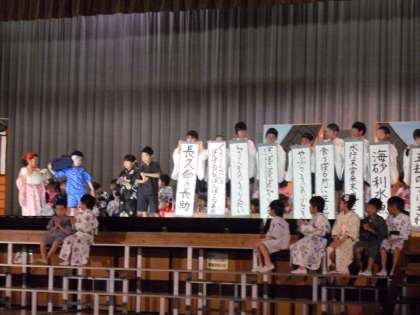1年生にとって初めての学芸会。楽しく「じゅげむ」を演じます。1年生が長いじゅげむの名前を覚えているので、2年生以上の学年も驚いていました。1年生の歌には、手拍子が起こり、みんなを楽しくさせてくれました。じゅげむが芦花小学校に入学する設定もおもしろかったようです。1年生、楽しく演じることができました。