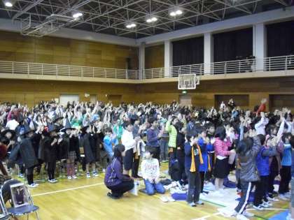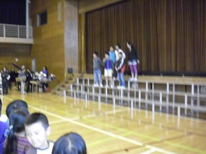 劇と劇の間に行う幕間の時間の様子です。次の学年の背景画や大道具を準備する間に、幕間の係がクイズを出したり、ゲームをしたりして楽しく過ごします。見た劇の内容に関するクイズなど、劇への興味・関心をさらに高める工夫をしていました。