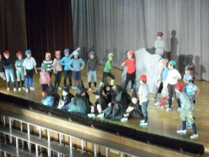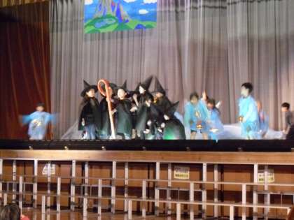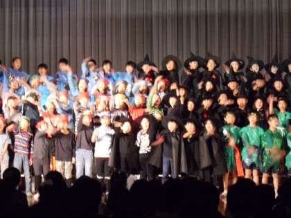 2年生の「三つのまほう」です。8曲の歌を中心にテンポよく劇が進みます。「エロイム エロイム エッサッサ」の呪文を唱える真似をしていた1年生もいました。1年生が目の前にいるので、リハーサルよりもお兄さんお姉さんらしく、胸をはって演技をしているようで、たのもしく見えました。