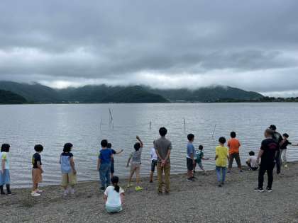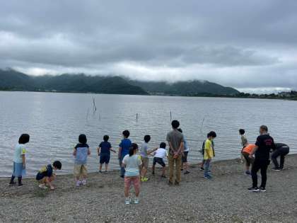 朝は、涼しく大きな河口湖に、子供たちは驚いていました。