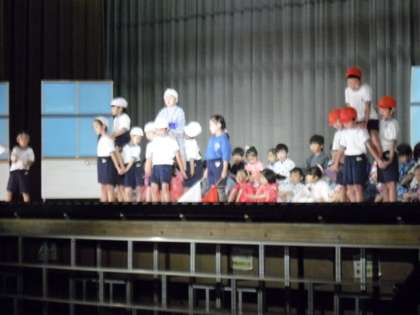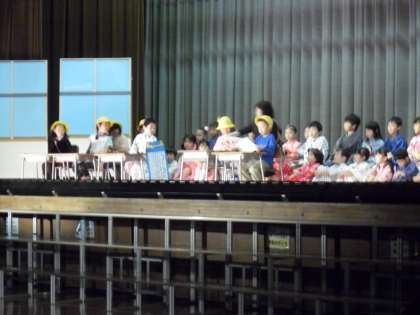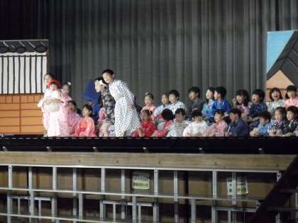 1年生の「じゅげむ」です。自分の台詞をはっきりと表現する1年生。着物を着た可愛らしい1年生の演技に、温かな拍手がわき起こります。じゅげむが、芦花小学校に入学して起こる様々なエピソードに会場も大うけでした。時折、保護者の方を意識しながらも全員で楽しく舞台を終えた1年生でした。