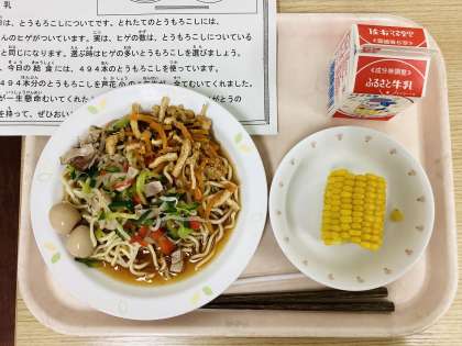 今日は、冷やし中華、煮たまご、ゆでとうもろこし、牛乳です。