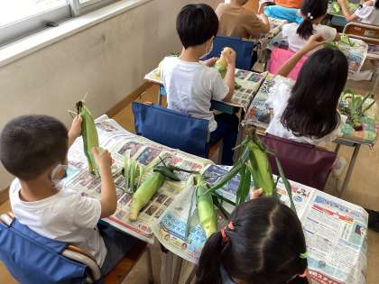 今日は、芦花小学校と芦花中学校分、合わせて494本のとうもろこしの皮を芦花小学校1年生のみなさんがむいてくれました。ひげも1本1本丁寧に取り除いてくれたので、とてもおいしい茹でとうもろこしになりました。