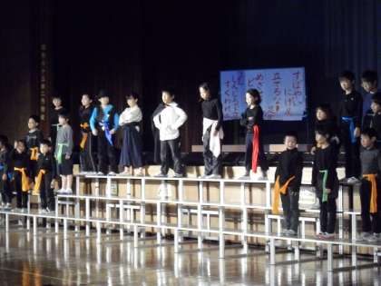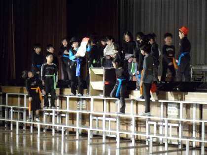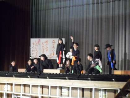 3年生の「どろぼうがっこう」です。どろぼうがっこうの生徒が先生たちから盗んだ物を紹介する場面やけん玉の特技を披露する場面では会場も大いに盛り上がりました。3年生もテンポよくのびのびと表現していました。最後の合唱も元気いっぱいに歌い、大きな拍手をもらいました。