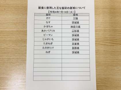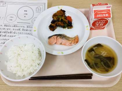 今日は、ごはん、魚の塩焼き、夏野菜の南蛮かけ、わかめとじゃがいものみそ汁、牛乳です。