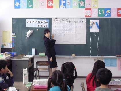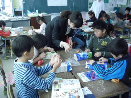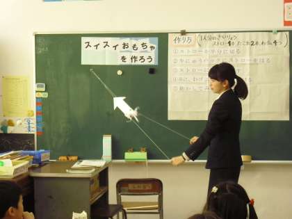 2年生の図画工作の授業の様子です。題材名は「2本の糸でスイスイと」です。牛乳パックを使った動く立体作りです。出来上がると試しに動かします。動くと嬉しそうに何度も繰り返していました。本校は、塾生を2名受け入れています。研究授業の際には互いの授業を見合います。この後の、担当教授の指導の中に互いの授業を見合っての協議もあります。授業を見る目を育てることも、授業力の一部です。